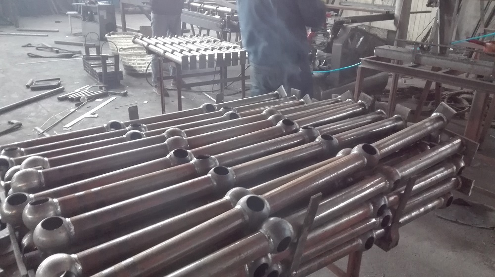 3)、穿入欄桿管件至第一根立柱半個球位,其余部分懸空。